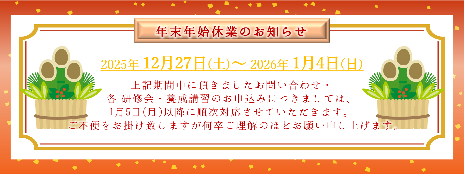 | 2025年 12月 …オンライン | 2日(火) 監理責任者等講習 3日(水) 技能実習責任者講習 16日(火) 技能実習指導員講習 17日(水) 生活指導員講習 |
